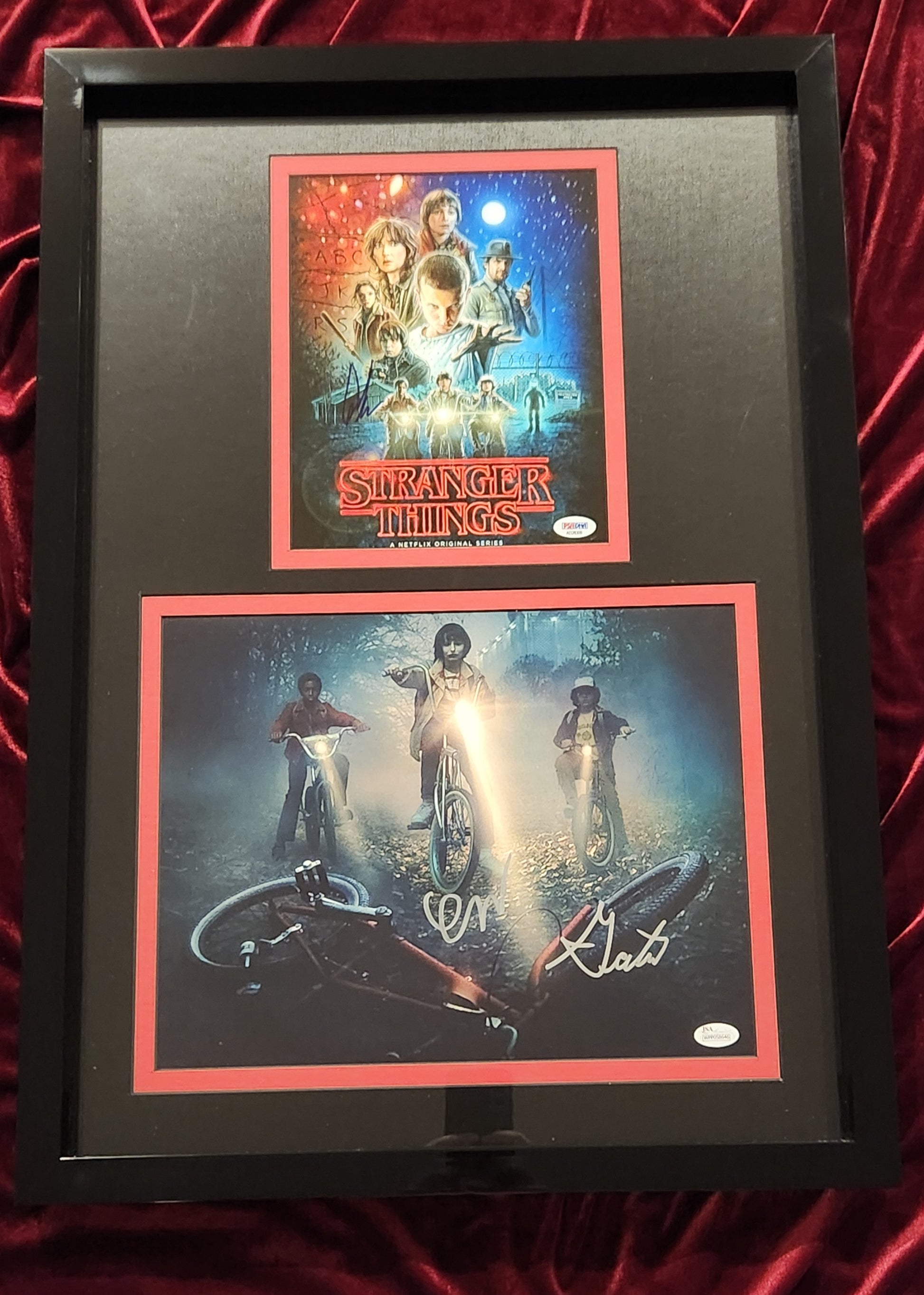 Stranger Things signed movie poster and photo by Finn Wolfhard who played Mike Wheeler, Garten Matarazzo who played Dustin Henderson and Caleb McLaughlin who played Lucas Sinclair in the Netflix TV Series. Custom framed with UV protected glass.
